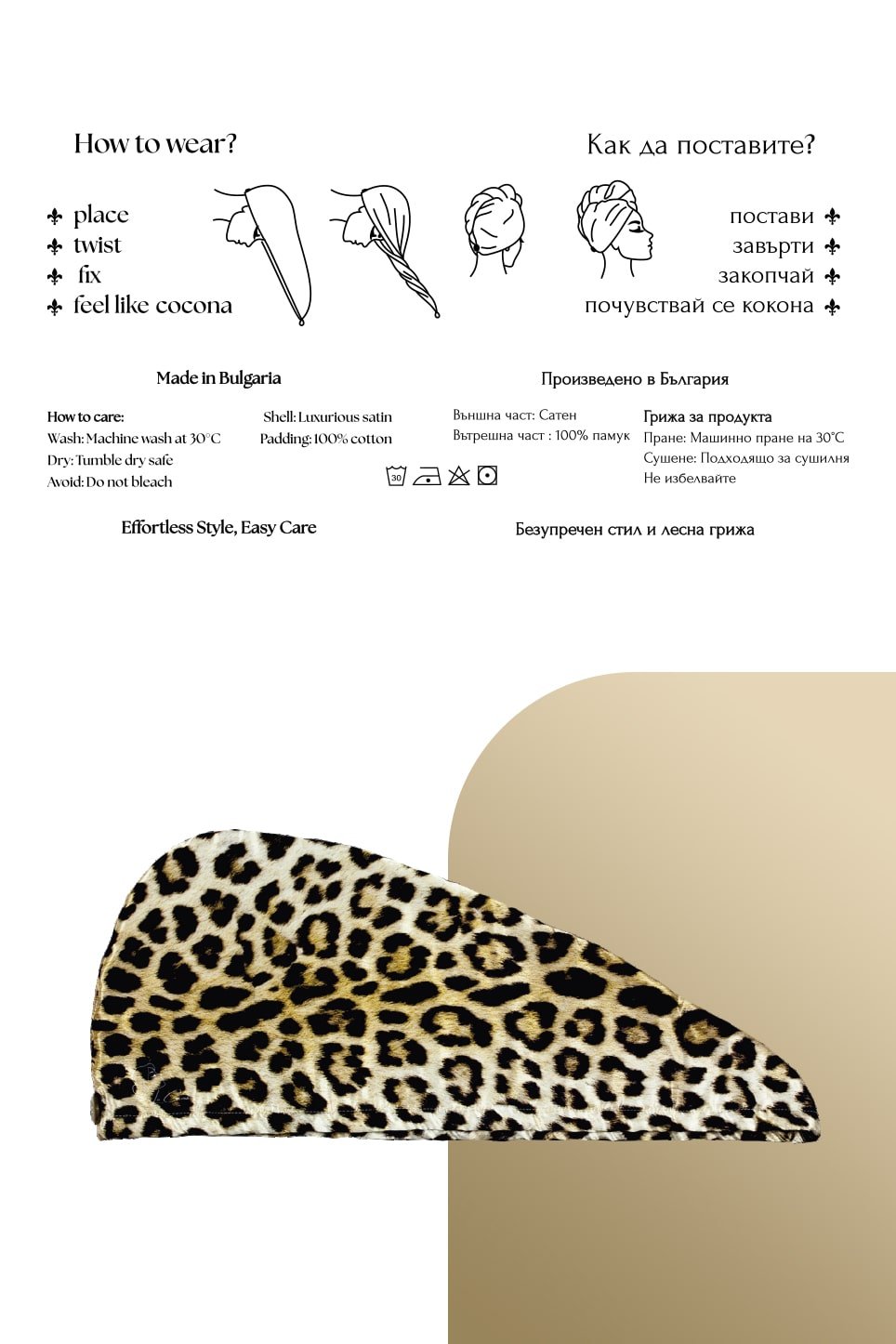 Satin head scarf with a classic LEOPARD print – our best-selling model that combines care and expressive style. The outer layer is made of soft satin with a delicate sheen that enhances the richness of the colors, while the inner layer is crafted from cotton fabric that is gentle on the hair and absorbs moisture. The warm sandy-golden tones, scattered with black and brown spots, create a sense of exoticism, elegance, and confidence. A scarf that is both practical for everyday use and a beautiful accent to any look.