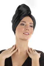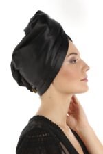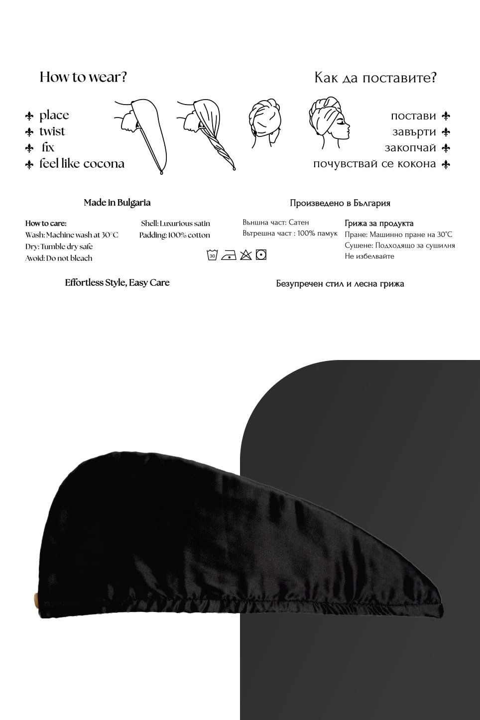 Сатенена кърпа за глава ЧЕРЕН САТЕН – израз на елегантност и изтънчен вкус. Изработена от мек сатен с копринен ефект отвън и памучна абсорбираща материя отвътре, тя е нежна към косата и удобна за носене, съчетавайки стил и грижа в едно. Тъмният цвят придава усещане за финес и мистичност, а деликатният блясък на сатена добавя изтънченост и гладкост на дизайна, превръщайки кърпата в класически, но впечатляващ аксесоар.