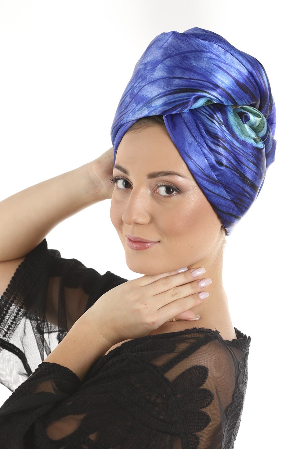 Сатенена кърпа за глава ПАУН – символ на елегантност и самоувереност, вдъхновена от красотата на едно от най-впечатляващите създания в природата. Изработена от мек сатен с копринен ефект и подплатена с памучна абсорбираща материя отвътре, тя е нежна към косата и удобна за носене, като съчетава грижа и стил в едно. Тъмно синия цвят носи усещане за спокойствие и изисканост, а върху нея се разгръщат изящни паунови пера със сини и зелени акценти. Този дизайн създава неповторимо усещане за хармония, увереност и изтънченост – израз на силната женска същност.
