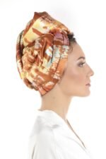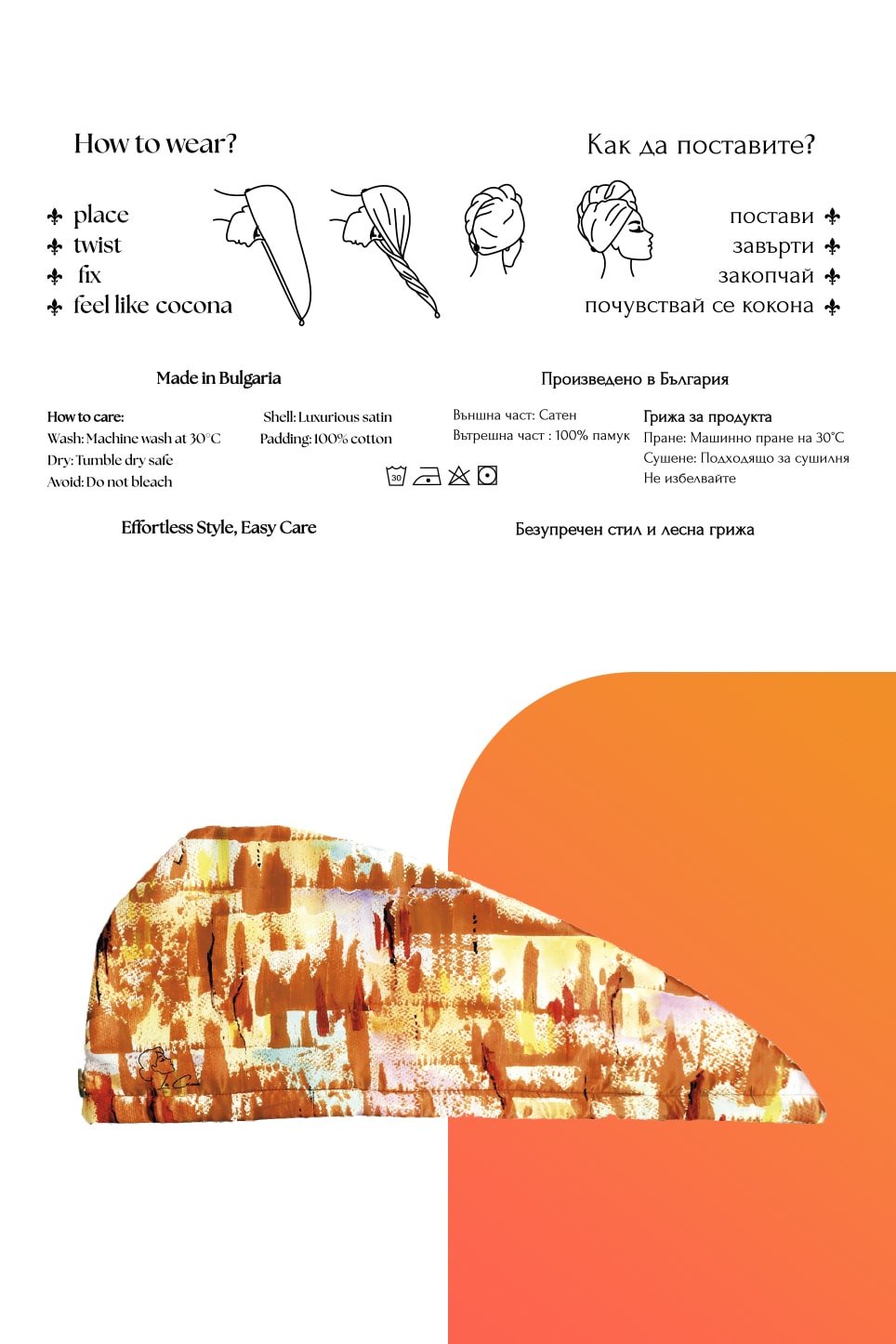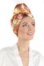 Сатенена кърпа за глава САХАРА– перфектен начин да внесете топлина, енергия и свежест във визията си. Изработена е от мек сатен с копринен ефект отвън и памучна абсорбираща материя отвътре, нежна към косата и удобна за носене, съчетавайки стил и грижа в едно. Топлите нюанси на жълто, оранжево и златисто създават усещане за жизненост и позитивизъм, напомняйки за мекия залез на слънцето, и превръщат кърпата в забележителен аксесоар, който добавя светлина и топлина към всеки момент.
